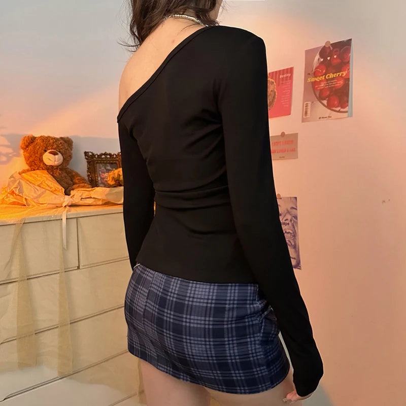 Skew Neck mit Nieten Skinny T-Shirt Damen Schwarz Langarm Design Top Damen Shirt